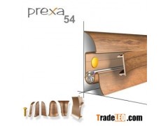 The mouldings are made of hard PVC and decorated by the method of tampoprint. The board consists of two parts: the moulding and the insert. The configuration of the moulding, the so-called pocket, enables the placing of electric wiring (electric installation, radio and TV, computer, telephone). The elastic rubber used in the upper and lower part masks irregularities of floor or wall as well as prevents penetration of water and dirt under the board. The mouldings are resistant to sunrays, water, cleaning liquids and to mechanical damage. The offer includes skirting boards, inner and outer corner slats and connectors, as well as left and right end bits in colours matching the boards. The construction of the moulding facilitates extremely fast assembly: the board is fixed directly to the wall. Prexa 54 is 54 mm high and 2500 mm long.The board is available in wood-imitating patterns.